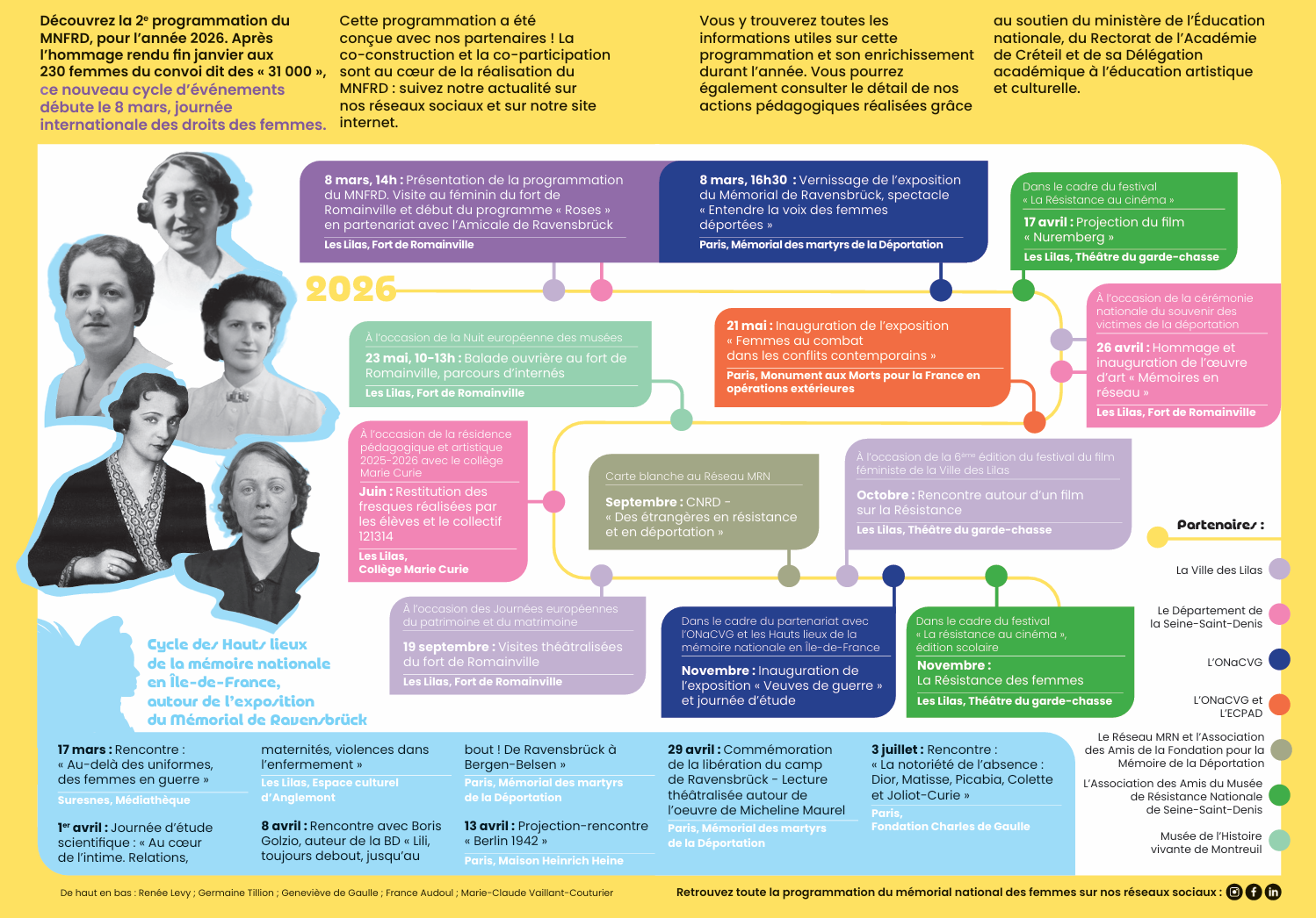 À l’occasion du 8 mars, le Mémorial national des femmes en résistance et en déportation a présenté son programme pour l’année 2026. Découvrez les prochains événements co-construits avec nos partenaires, objectif essentiel du MNFRD. Vous pouvez également nous suivre sur les réseaux sociaux pour connaitre les dernières actualités de la programmation.